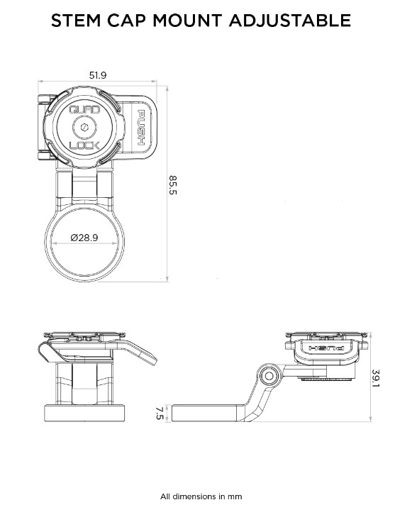 The Adjustable Stem Cap Mount from Quad Lock allows cyclist to keep GPS maps, messages and a mobile devices securely mounted front and center. Pop off your stem cap, insert the Quad Lock mount, reinstall your stem cap and go. This simple design fits a wide range of bicycles and provides angled adjustments up to 35-degrees. Reverse the mount for additional clearance and adjustability up to 55-degrees.