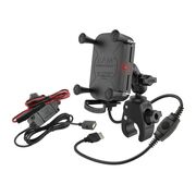 RAM X-Grip Waterproof Wireless Charging Mount with Tough Claw grasps securely onto most 7/8" and 1-1/2" bars. This kit features a phone mount with integrated wireless charging, a versatile dual socket arm, bar clamp, and a fused wire harness for bike battery connection. Equipped with a spring-loaded X-Grip cradle, it customizes the fit for your phone via expansion and contraction. For motorcycle applications, the X-Grip includes a recommendable device tether. The cradle accommodates handheld devices as per the dimensions provided. Verification of your handheld device's dimensions inclusive of a case/sleeve/skin is critical in determining the overall fit.