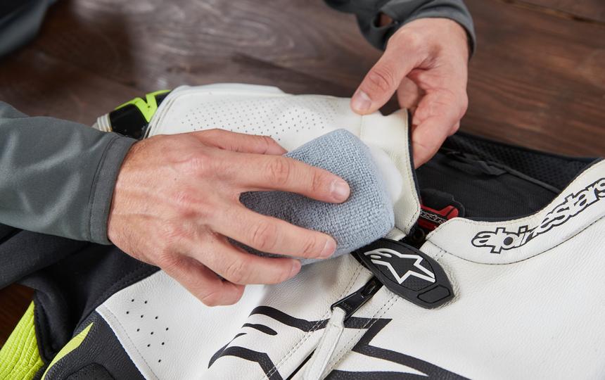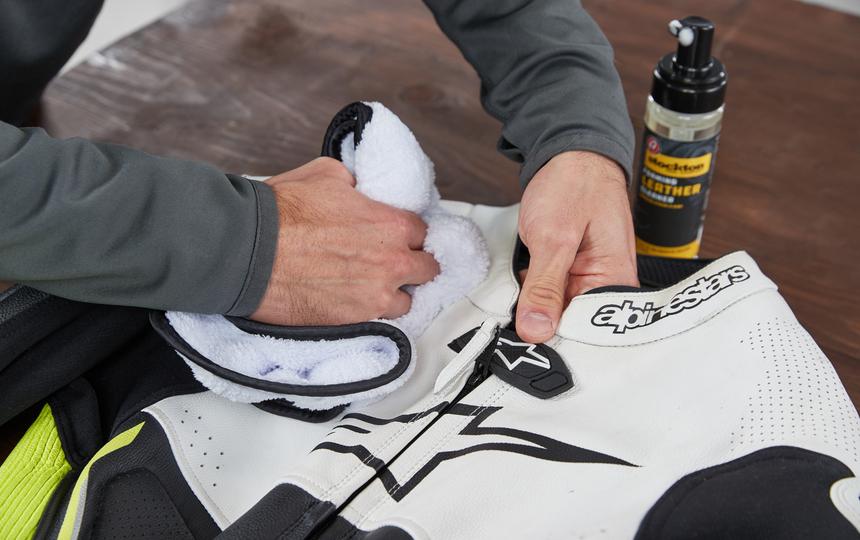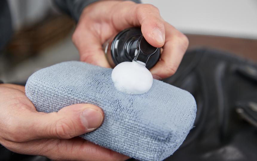 Stockton by Adam's Foaming Leather Cleaner effectively removes stains and dirt from leather gear. Its foaming action makes cleaning jackets, suits, and pants easier.