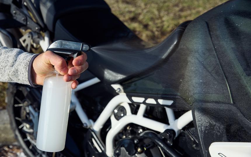 Following washing the bike and while it is still wet, mist the diluted Rinse and Seal solution onto all exterior surfaces working one section at a time.
