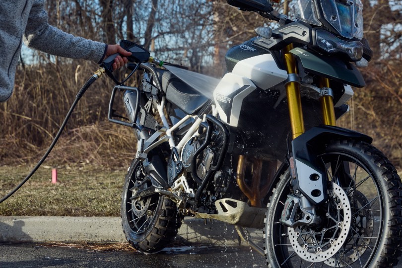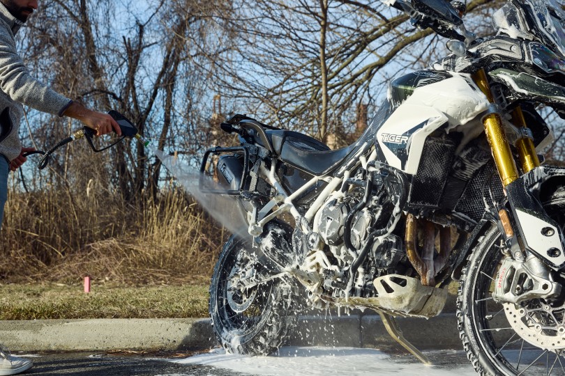 Pre-rinse bike with pressure washer to remove heavy dirt, mud and other debris from the surface.