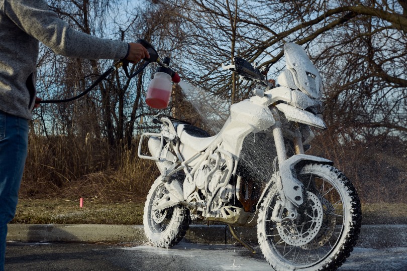 FULLY ALLOW BIKE TO COOL BEFORE WASHING. If it's too hot to touch it's too hot to wash. Not only do you risk hurting yourself but you also risk ruining the finish of your bike/exhaust/engine if the bike is hot while washing. If your bike is ceramic coated or has a fresh application of sealant or wax, please note that the foam may not cling to the slick surface as well. IMPORTANT: Foam cannons must be cleaned after every use to avoid clogging. Fill the canister with water only, then spray it through the pressure washer for at least 1 minute to ensure Supreme Foam Wash residue is fully removed from the foam cannon internals. Failure to rinse it out can cause soap to dry and clog the cannon.