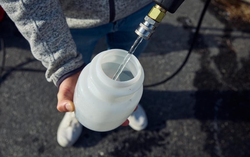 Fill foam cannon or foam gun canister approximately 4/5 full with clean water.