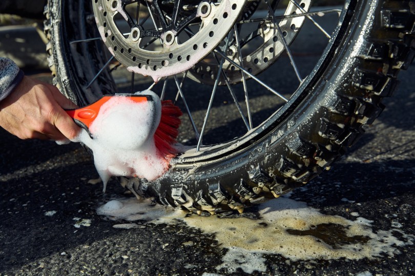 Scrub the tire sidewall with a tire brush and wheel surfaces with wheel brush. Do not allow product to dry onto any surface of the wheel.