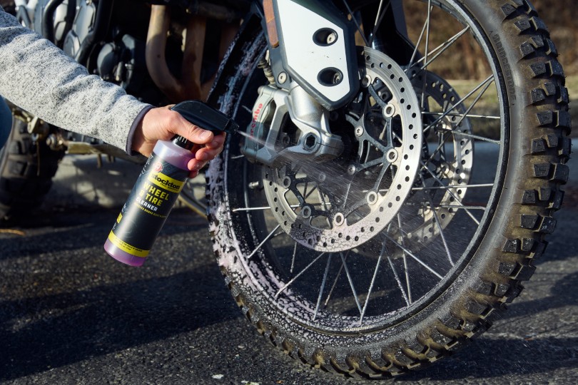 Stockton by Adam's Wheel and Tire Cleaner simplifies cleaning. It targets brake dust, chain fling, and tire browning, making wheel and tire maintenance easy.
