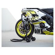 The ST975 stand succeeds Vortex's ST943 model, offering enhanced versatility and compatibility with a broader spectrum of motorcycles. It boasts oversized 4.25-inch wheels equipped with dual-sealed bearings to ensure smooth and stable maneuvering. Crafted from heavy-duty steel tube, the stand exhibits lasting durability and integrates plastic glide plates for augmented protection. The stand's design allows for easy disassembly, streamlining storage and transport, and provides effortless lifting capabilities. Five pins (13, 15, 16.5, 17, and 18mm) are included with the stand to accommodate numerous applications, while additional sizes (19, 20, 21, 23, 24, and 27mm) are available for purchase separately.