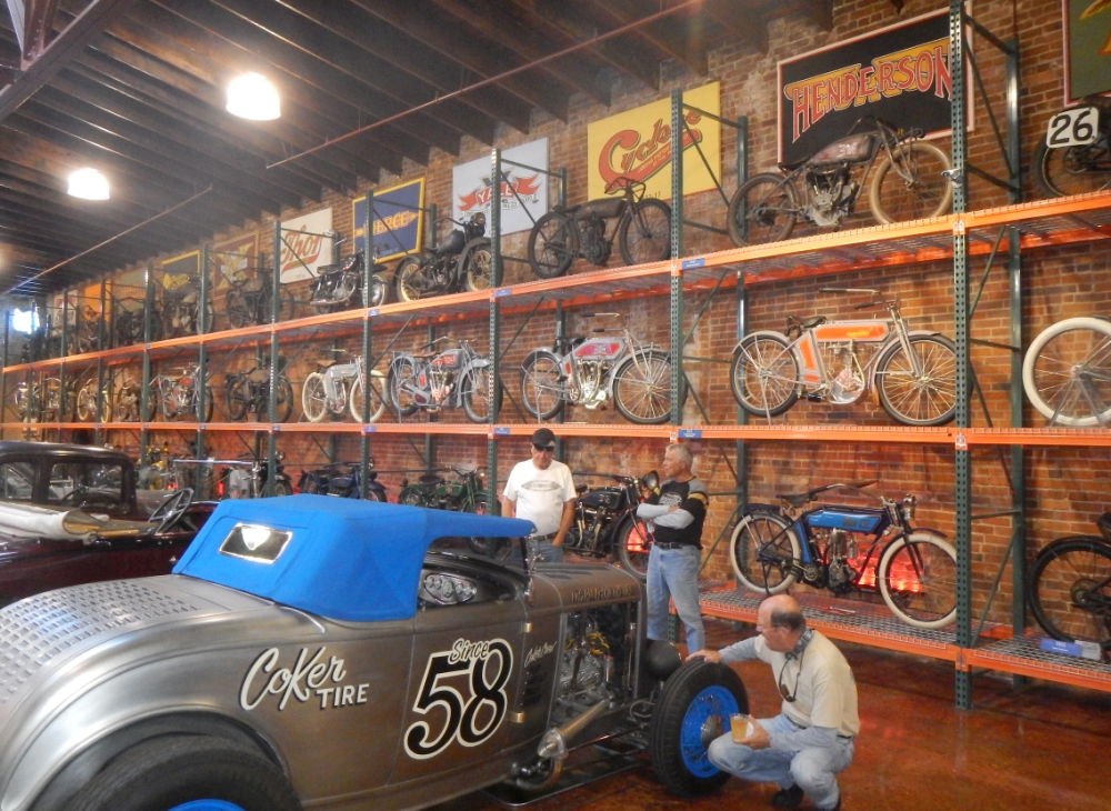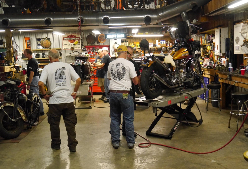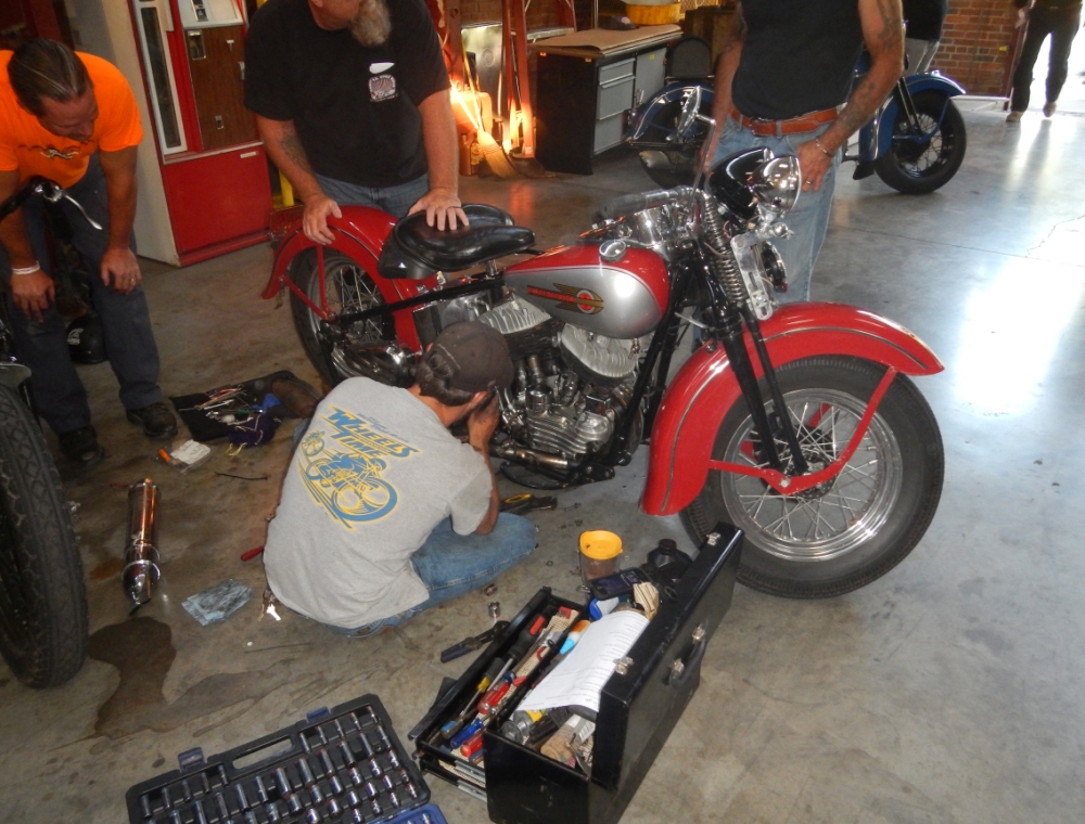 We made it to Chattanooga, Tenn., by dinner time and pulled into the parking lot at the Coker Tire plant. Coker Tire provided a great meal and gave us unfettered access to their collection of antique cars, motorcycles and planes. Even though the food and scenery were excellent, what everyone enjoyed most was access to their spotless workshop. As old motorcycles were pushed in for repairs, everyone broke into small groups to triage the machines. Soon, the wrenches were out and an excited buzz could be heard across the shop, as one bike after another was made ready for the next day’s ride. For me, this is always the most enjoyable part of the event, because it gives me the chance to learn about so many different motorcycles from people who have years of experience working with vintage machines.