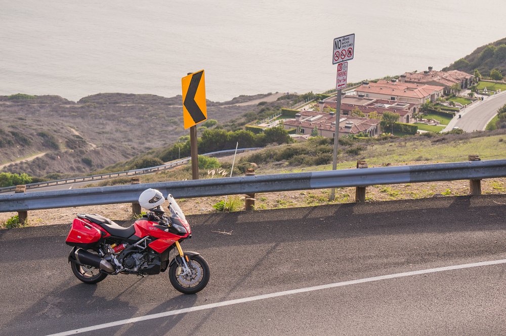 The Caponord is an absolute blast once you hit the twisty stuff, as long as it isn't too tight and technical. For instance, the bike was excellent for Ojai's Highway 33 and its long sweepers, but trying to hustle it through Mulholland Highway in Malibu became a chore and had me wishing I was on our Suzuki DR-Z400 or Triumph Street Triple R. The bike doesn't hide its 550 pounds particularly well, and getting the bike flipped over from side to side definitely gave me a pretty intense upper body workout.