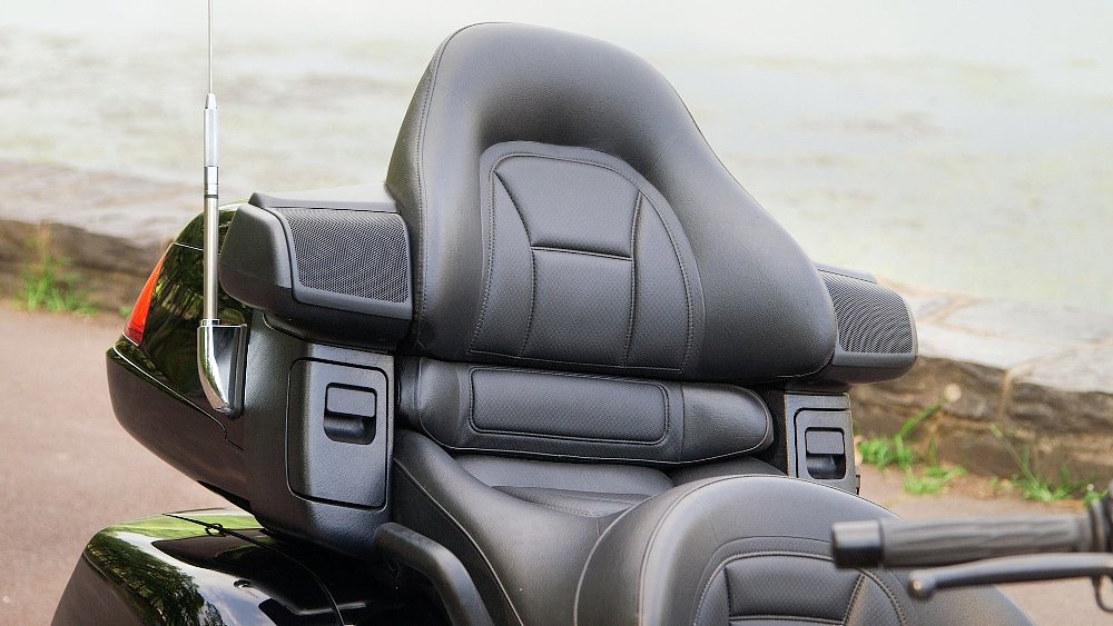 I’ll probably be all over the map here, because there are all manner of little niceties to point out on the Wing that made my life good, and my wife had a similar list. The ride on this bike was, as I have said, acceptably good. The seating arrangement is fabulous. The Wing has a great stock seat, and I was sitting nice and upright, with my feet immediately beneath me and my hands in front of me in a very natural spot. My wife was also really comfortable. Several times I noticed her kicking back and using the padded spots on top of the speaker to change up her position. We had some room between us, which was a nice change of pace — no sweaty back for me. Miles are easy to rack up on this bike because your body is not contorted.