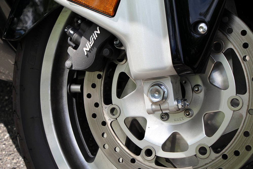 Honda's combined braking system, which links the two front discs and single rear disc, is standard on the Gold Wing. If the rider uses either the front lever or the foot brake, the system applies braking force both front and rear. Adding anti-lock brakes gets you what Honda calls C-ABS, but that's an extra-cost option.