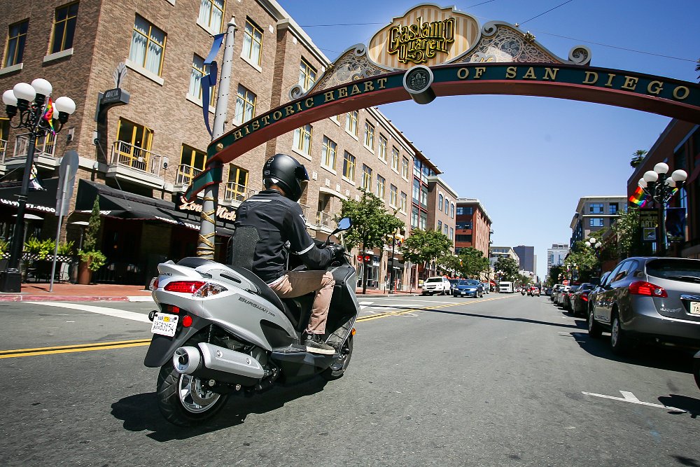 Scooters were made for the Gaslamp Quarter. Riding the 2014 Suzuki Burgman 200 ABS. Suzuki photo.