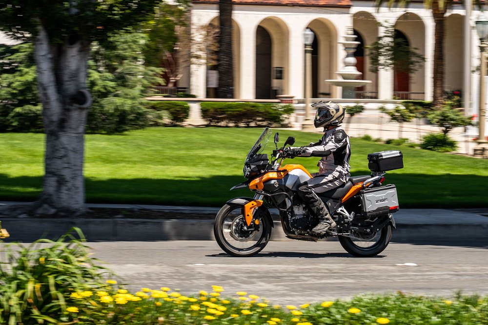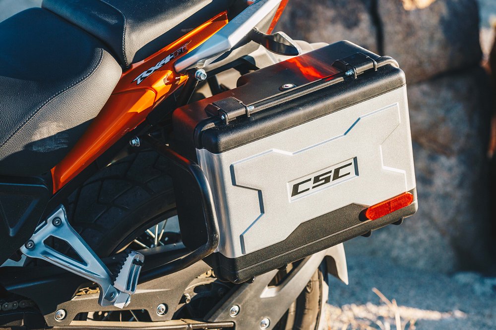 The luggage is largely great. The side cases and top box are included in the base price, for starters, and they’re far sturdier than some accessory options from Japanese manufacturers (specifically the $440 cases Kawasaki offers for the Versys-X). The CSC luggage is also keyed to the ignition and you have the option to upgrade to aluminum “Tourfella” cases for an additional $425 at the time of purchase.