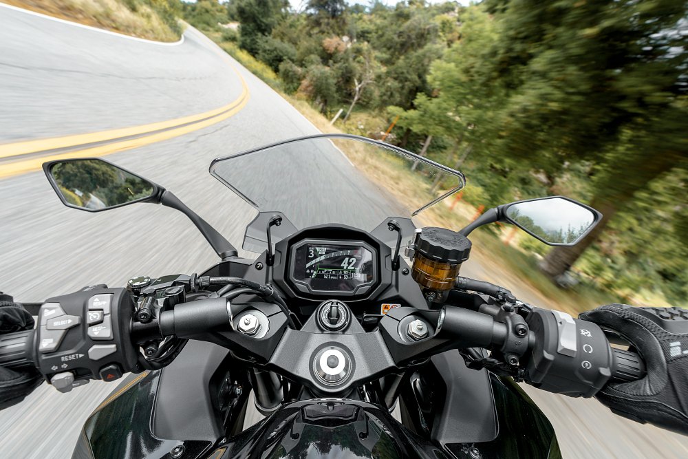 Here, yet again, the motor is the star of the show, dishing out thrilling acceleration if not an exciting exhaust sound. Sure, power trails off beyond 9,500 rpm, but with such a robust midrange there’s no need to rev it that high. There’s really no need to shift, either, but I still did for the joy of using the new bi-directional quickshifter. It’s not perfectly calibrated, but it’s also completely superfluous, so kudos to Kawi for including it as a means of making this new Ninja feel a lot sportier.