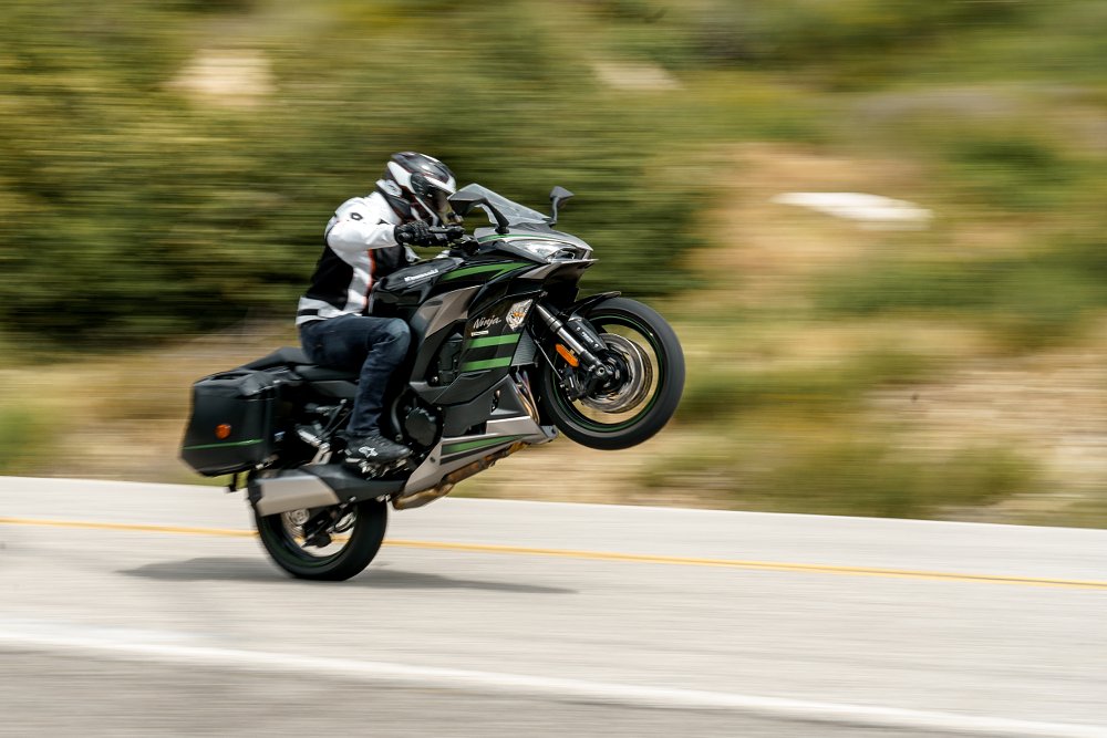 Dial up the speed and the force of your steering inputs and the Ninja starts to show its weight, as well as the conservative tendencies of its KHI software engineers. KIBS, which polls information from myriad data channels to develop a comprehensive view of what the bike is doing, seems as concerned with maintaining chassis composure as maintaining traction. That’s a good idea in theory, but when you’re having a blast hustling your big-bore sporty tourer down a magnificently twisty back road and KIBS kicks in because you transitioned quickly while trail braking, it’s a little annoying. Similarly, aggressive straight-line braking can trigger the front ABS, not because there’s a loss of front-tire traction (honestly, not even close) but presumably because the IMU doesn’t like how much the bike is pitching forward. I could cheat the system and delay ABS interference by applying the rear brake a moment before squeezing the front to help keep the chassis settled, but I found it a bit paradoxical that I had to outsmart the “intelligent” braking system in order to enjoy the bike.