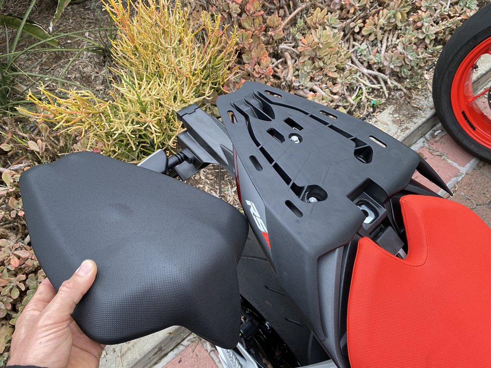 My test bike (VIN 000003!) was fitted with a prototype seat cowl, but the RS comes with a passenger pad that is actually large enough to be called a seat. The exhaust routing keeps hot bits away from your body, and the under-engine exit leaves plenty of room for extended passenger footpeg brackets, so the person on the back can actually feel secure.