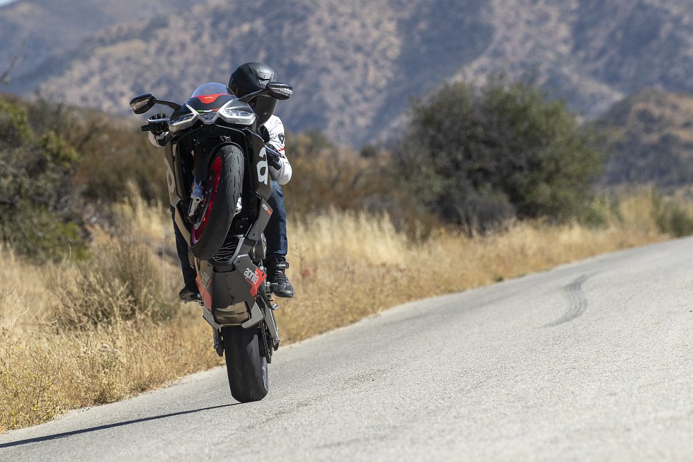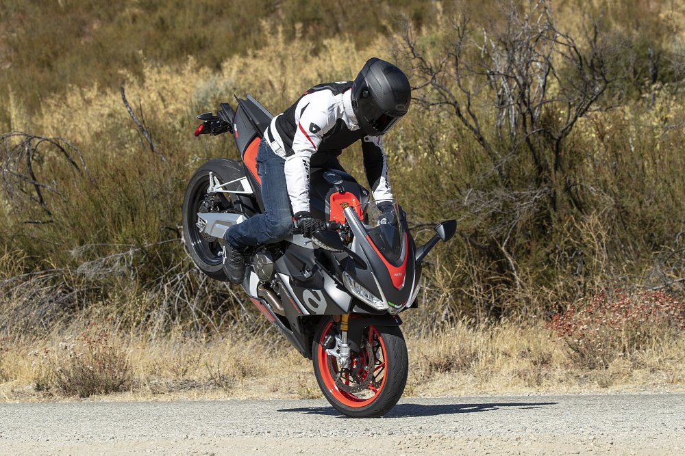 The new engine that was so tractable and polite around town and relaxed on the freeway wakes up when you goose it, though the robust midrange grunt means that there’s really no need to spin it to redline. It won’t loft the front wheel on command or break the sound barrier like an RSV4, but you can easily clutch up a wheelie in first or second gear and the bike accelerates quickly toward a likely top speed of 140 mph.