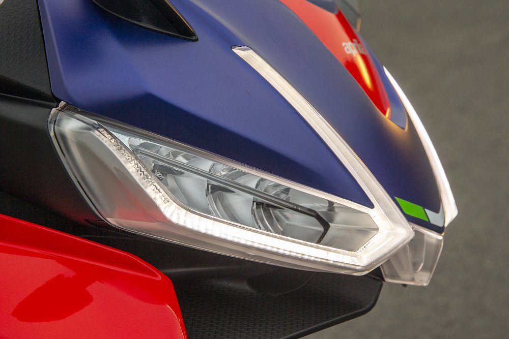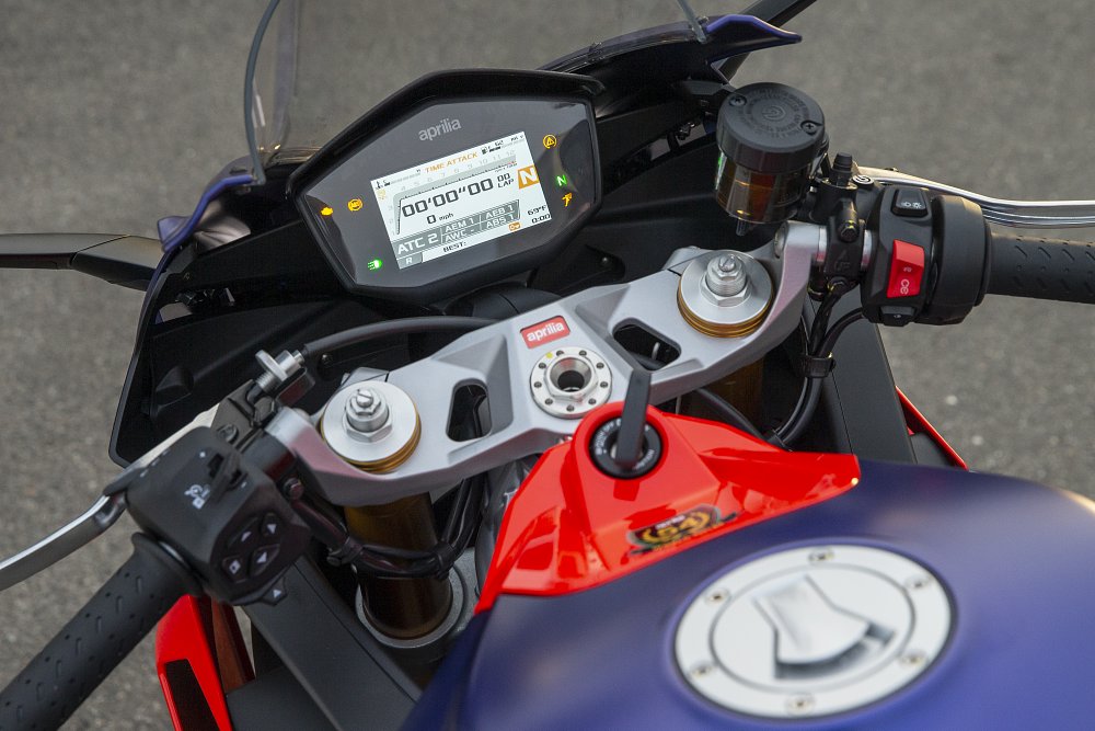 As mentioned earlier, the rider triangle is reasonable and the seat is supportive, so droning along the highway isn’t a test of one’s endurance. Cruise control relieves your right wrist of responsibility, and even if the arced windscreen isn’t tall enough to fully route wind around your helmet and torso, the well refined bodywork leaves you sitting in smooth airflow. The distinctive layered fairing design is said to be especially aerodynamic and serves to divert engine heat and provide a stabilizing effect at speed, similar to what the wings on the RSV4 do.