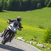 Steel trellis tubes join geometric aluminum side plates, and a cast aluminum swingarm brings up the rear. The ZF Sachs monoshock’s 2.2-inch stroke translates to 5.9 inches of rear wheel travel. The shock uses traditional preload adjustment collars, and it also features rebound adjustment. I noticed a fairly broad section of preload adjustment threading to compensate for a passenger and luggage. Up front, ZF Sachs also supplies a 43 mm fork with 5.9 inches of travel. The fork is adjustable for preload and rebound and compression damping.