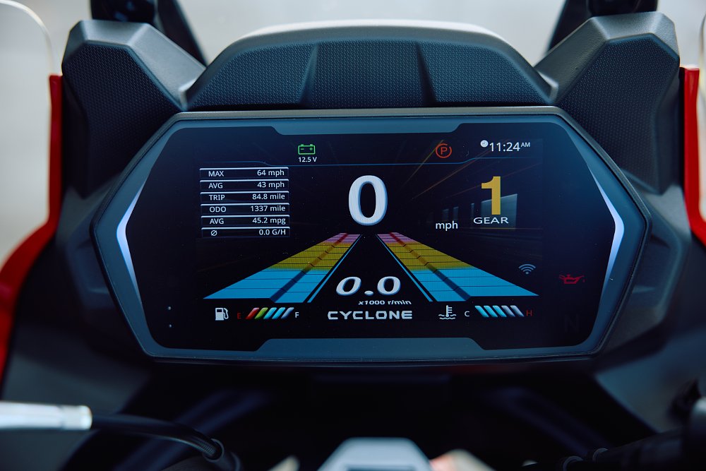 Other features include LED lighting, USB charging outlets, and a tire-pressure monitoring system, but the seven-inch, full-color TFT display takes top billing. Manufacturers often reserve high-tech gadgetry of this ilk for bikes in the five-figure price range. I hope the blind-spot detection and adjustable windscreen features I didn't get to test work well, because the TFT panel offered an imperfect user experience.