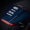Set against a bright white-painted trellis frame, the Candy Blue, carbon-fiber bodywork finish is subdued yet distinctive. Red and white graphics complete the treatment while also capturing the pride of the two American brands.