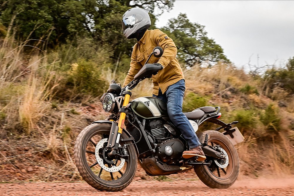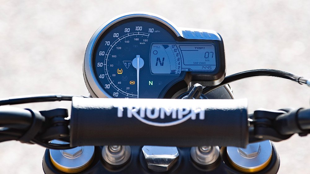 The reason for that is that Triumph outfitted the Scrambler with non-metallic pads for gentler front-end braking off-road. With cast wheels wrapped in Metzeler Karoo Street tries, however, the Scrambler isn’t begging to venture onto the loose stuff all that often. Our off-road route, which Triumph restricted to a one-mile green lane (or fire road if you don’t speak British English), only supports that statement. For the few Scrambler riders who spend a lot of time on dirt, the front brake makes sense. But I suspect most riders will spend almost all their time on pavement, and they would be better served by brake pads that provide greater stopping power from a lighter lever tug. Fortunately, the brake calipers are the same so Triumph engineers confirmed that Scrambler riders could switch to the Speed's brake pads for an easy solution.