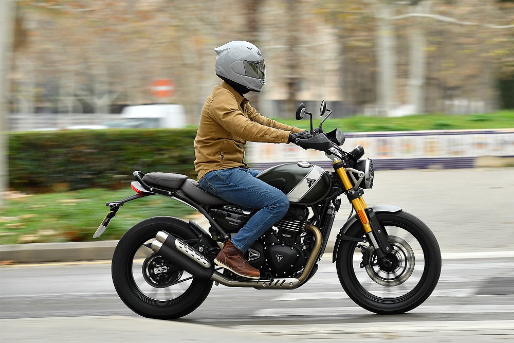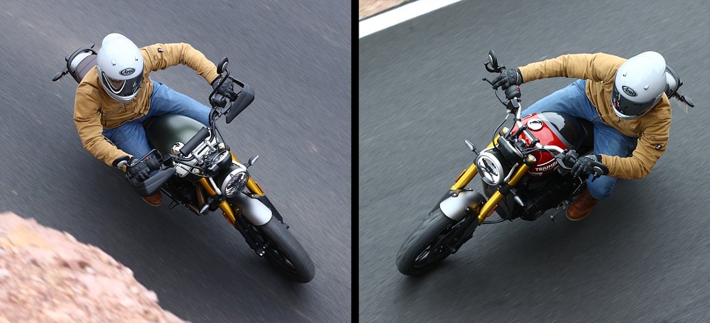 The Speed’s cockpit is much more compact by comparison. Reaching the handgrips requires little effort, yet the resulting position still nudges the pilot’s weight closer to the front wheel. Considering the Speed’s sporty aims, that’s an advantageous quality. The Scrambler’s rider triangle is even more relaxed. Hinckley engineers counteract the frame’s longer neck by rotating the handlebar back toward the rider, which leads to a bolt-upright posture. That’s not the only difference in the ergonomics.