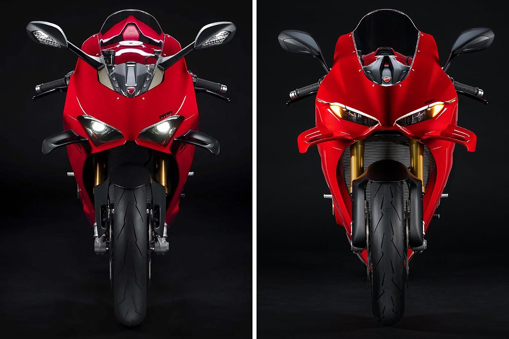When it comes to the Panigale's new look (right), Ducati’s designers fused elements of the legendary 916 sportbike and Desmosedici GP race machine. It’s a clear departure from the previous-generation V4 (left). Ducati photo.