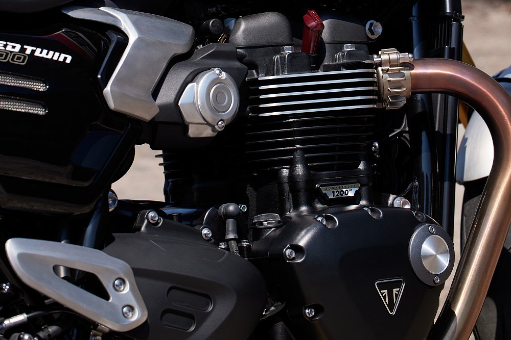 Triumph’s liquid-cooled, 1,200 cc parallel-twin engine still powers the Speed Twin but a new camshaft nudges horsepower up 103.5 (at 7,750 rpm) while maintaining peak torque of 83 foot-pounds (at 4,250 rpm). Along with the camshaft’s performance benefits, it also helps the platform meet strict Euro 5+ emissions standards. Hinckley didn’t restrict the engine updates to the internals, either. The 270-degree p-twin also comes dressed in new engine casings that Triumph describes as “leaner and more angular.”