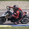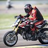 The circuit surface was smooth by U.S. standards and rough by European standards. The Öhlins fork and shock would cross all the ridges, cracks, and holes with nary a bobble. The Brembo brakes fore and aft are all very high specification and, given the bike's light weight, were more than up to the task. This being a Hypermotard, the ABS can be configured to disable the rear ABS entirely (the most fun but hardest on rear tires) or the rider-assist mode that allows you to lock the rear but the ABS will take over brake modulation again if the bike incurs too much yaw or leans over past 35 degrees. Burn-outs will fault the traction control and ABS system but, in the interest of science, I did test that the bike will allow them.