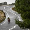 long view of the rider on the Ducati Monster descending a curving road on a hillside in light rain