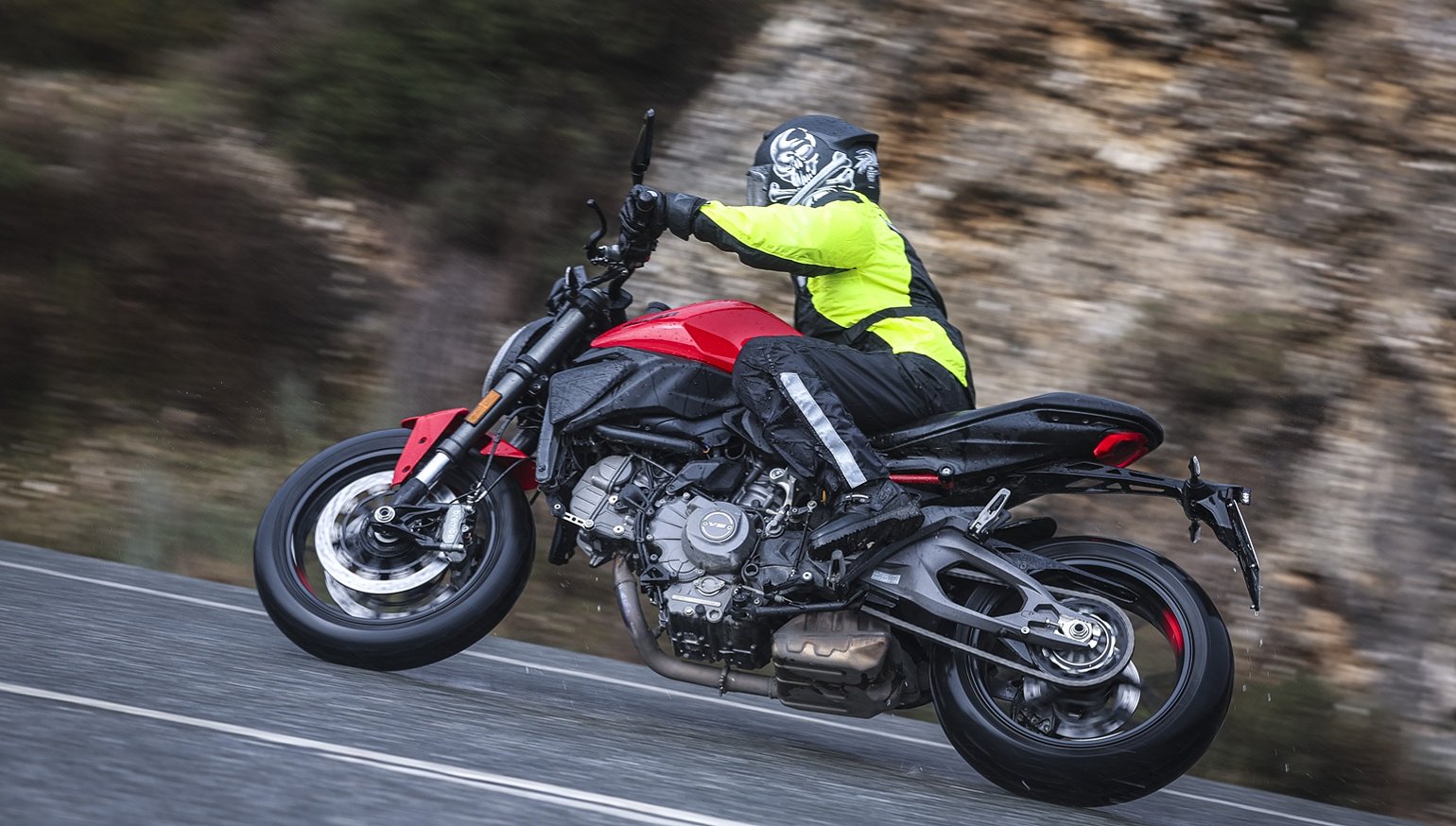 riding the Monster in the rain on a curvy road