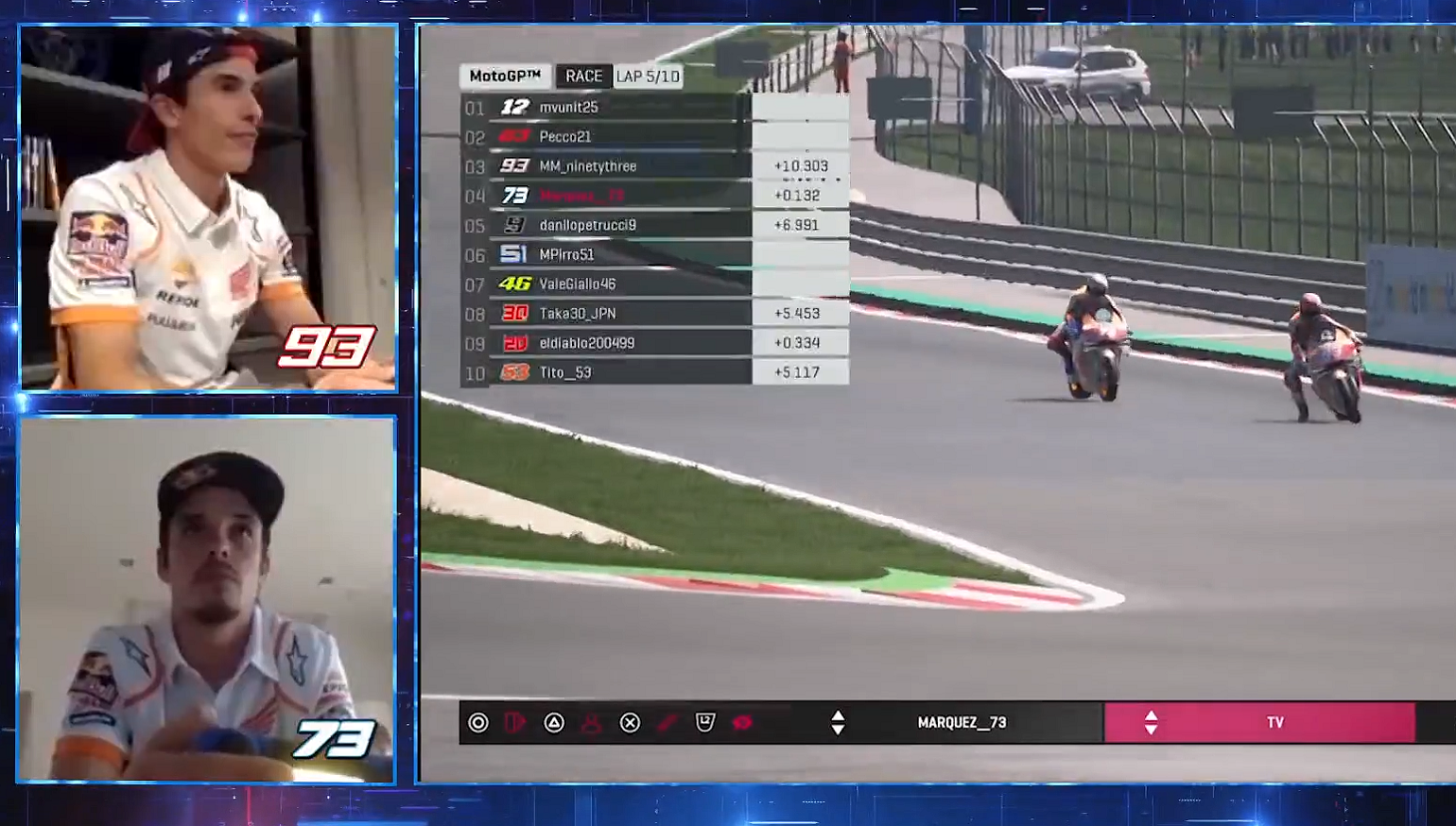 Lorenzo is seated in his personal Thrustmaster auto sim rig, but he’s using just the seat and screen. He’s racing with a standard hand-held controller. If he’d been in a virtual automobile race, that sim rig would come close to a real driving experience. But watching him “race” a virtual motorcycle, it’s striking that he’s so physically inert.