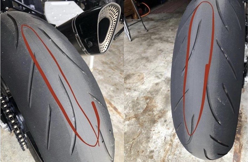 This is the rear tire on my Vitpilen 701 after an hour on a concrete freeway. I’ve never seen this before in 30 years of riding. Is this what rain grooves do to tires? — @max_breemer