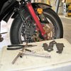 The Ninja’s brakes stopped it, but not that enthusiastically. It took a lot of lever or pedal travel to wake them up, and here in deer country that can mean the difference between you and Bambi parting as friends or meeting as combatants. The pads were semi-metallics, known to be kind to disc rotors and to last a long time, but not renowned for fierce stopping power. I replaced them with HH sintered-metal pads. They have right-now initial bite and send much more reassuring messages through the lever.