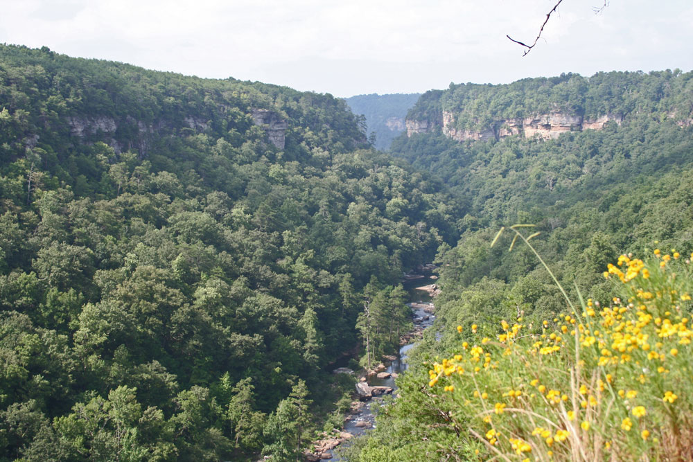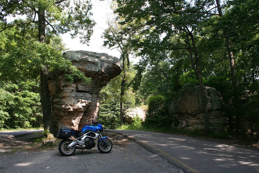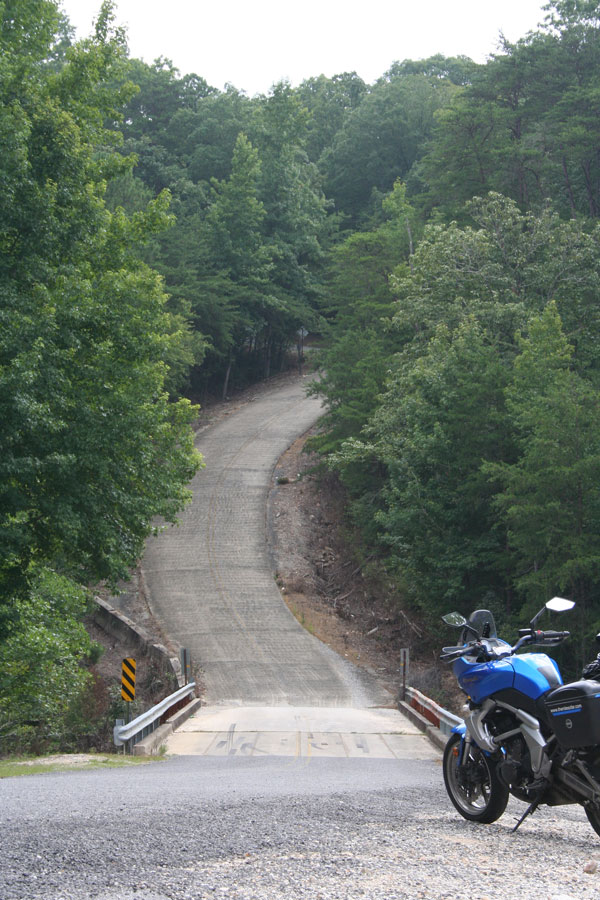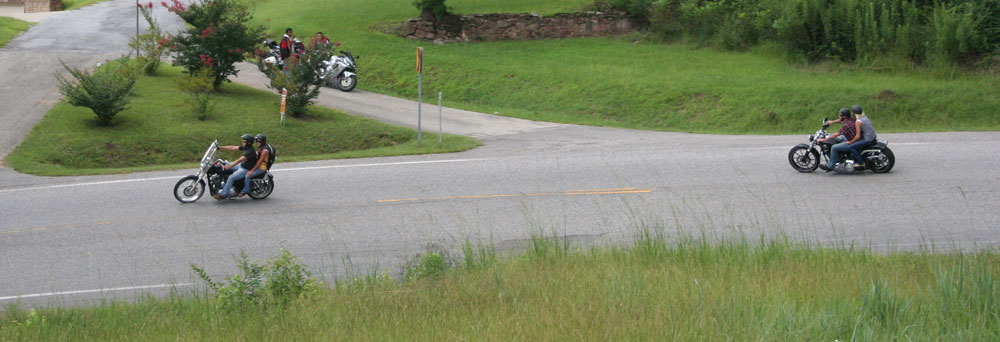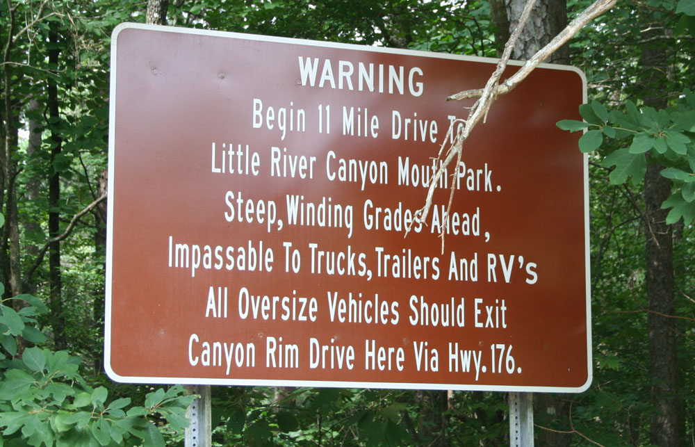 For the first 11 miles, Canyon Rim Drive follows Alabama Route 176. It’s a low-speed road, full of blind rises and turns and you’ll be stopping every so often at yet another pullout for a view of the ancient sandstone cliffs plunging 600 feet into the gorge, so don’t expect to make time or drag knees. Though curvy and tight, you could imagine this road being negotiated by Ma and Pa Motorhome, crawling around 176’s turns, heaving and wallowing in their RV but making steady progress, at least. When it comes to the second 11 miles, however, Ma and Pa had best choose discretion over valor or else they’ll risk discovering the joys of a steep downhill grade followed by a 180-degree hairpin that can turn a Holiday Rambler into a smoldering roadside monument to brake failure faster than you can say “Hold on, Ethel!” It’s pretty fun on a motorcycle, however.