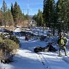 At the edge of a massive stand of Jeffrey pines, obscured beneath several inches of untrodden snow, was our single-track trailhead. Everything we’d ridden so far was accessible by car or truck, and we hoped the remoteness this trail afforded would mean primo, motorcycle-size trees. We’d seen some attractive options so far — as well as plenty of clean-cut stumps — but nothing that stopped us in our tracks. Like Clark Griswold, we were committed to finding the ideal trees to adorn our living rooms.