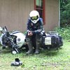 June 11, 7:02 a.m.: Prep bike. Pull off panniers and footpeg rubbers, attempt to rotate bars. Realize bars are retained by external Torx fasteners. Fathom stupidity of external Torx fasteners. Scratch head about German engineering again.