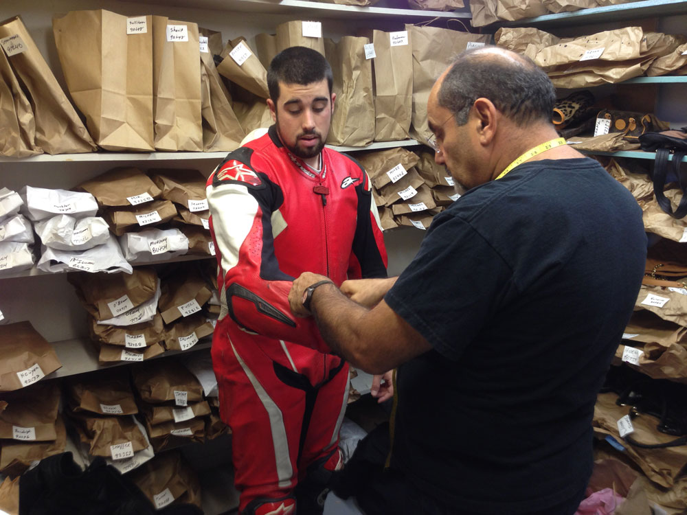 Cody put on the suit and discussed with the tailor which areas he felt were problematic. The tailor had a ton of experience with leather race suits and was able to point out many areas where either more or less room was needed, based on certain riding positions. He took a few basic measurements and made a few marks with chalk in various places on the suit and told us we were done. Overall, the process only took about 15 minutes and then we just had two wait two to three weeks to see if the guys at Anthony’s could really cut away the right amounts in the right places to make the suit fit again.