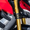 Naked bikes aren’t often as stable as their full-faired counterparts since they have a higher center of gravity and the rider is out in the breeze. The typical recipe sees the wheelbase lengthened and the steering geometry relaxed to increase stability. And while the Streetfighter has a 15 mm longer swingarm, Ducati left the steering geometry superbike-steep, and instead introduced MotoGP-derived wings to improve high-speed stability.