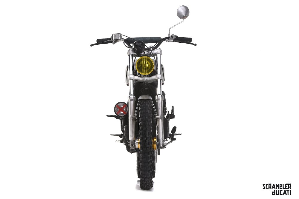 I'm surprised Ducati didn't release some sort of cafe version of the Scrambler. Why Mr. Martini chose the Urban Enduro to turn into a bullet-fairinged cafe is beyond me, but the result reminds me of the Moto Guzzi V7 Racer. This is easily my least favorite of the three. The height of the headlight and slight upward slope of the tank have it looking a little more upright than most cafe builds, and that flat bar almost looks like something out of Sons Of Anarchy behind that fairing. Also, how is this the one that got a high pipe?