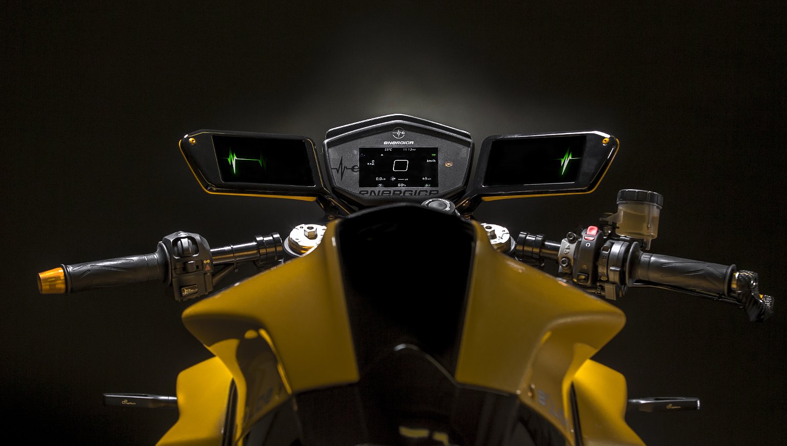 The “Samsung Heads UP Display” intelligent mirrors are A8 Galaxies with their smartphone functionality disabled. These phones currently retail for around $300 to $350, and that’s not counting the camera setups and other technology needed to run their functions. Over half a grand for “mirrors” is more than I’d want to pay, but a production version could be built for less using only the components it needs. The “intelligent mirrors” flank a typical Energica display. Placing them so far inboard means the rider can see them easily. They’re also better protected if the bike goes down.