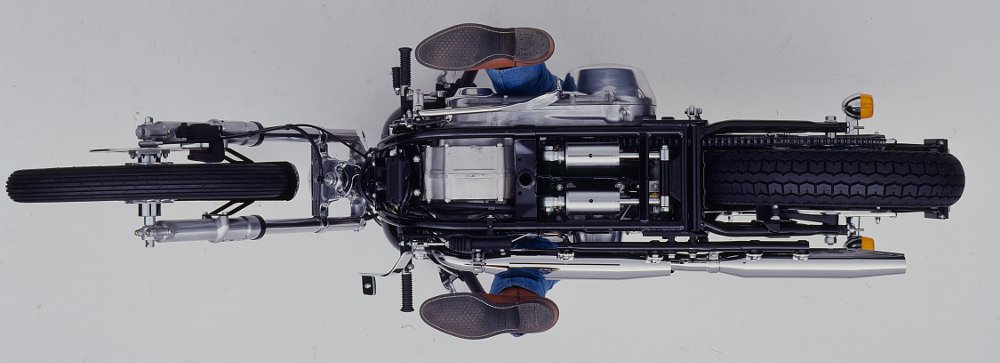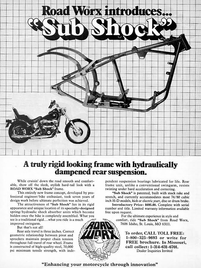 In 1976, Davis pitched his design to Willie G. Davidson, Harley’s chief styling officer. While the Motor Company passed on the proposal, Davis didn’t give up on the project. Instead, he refined the design, tucking the rear suspension under the transmission (and freeing up space to mount a classic horseshoe oil tank below the seat). The result was the “Sub Shock” frame, which Davis sold under his Road Worx banner.