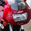 For the finishing touches, I employed most of the tricks shown in my article on cheap aesthetic improvements for dingy motorcycles. It’s amazing what a little elbow grease and spray paint can do. It takes all of 10 minutes to remove and paint the radiator stone screen. Bam, instant improvement with minimal work. High-temp black took care of the muffler caps, and a spare set of Kawasaki tank decals was donated from my brother's parts stash. It's still very obvious that the tank and tail were badly repainted at some point. Maybe the next owner of this motorcycle can pony up for new plastics.