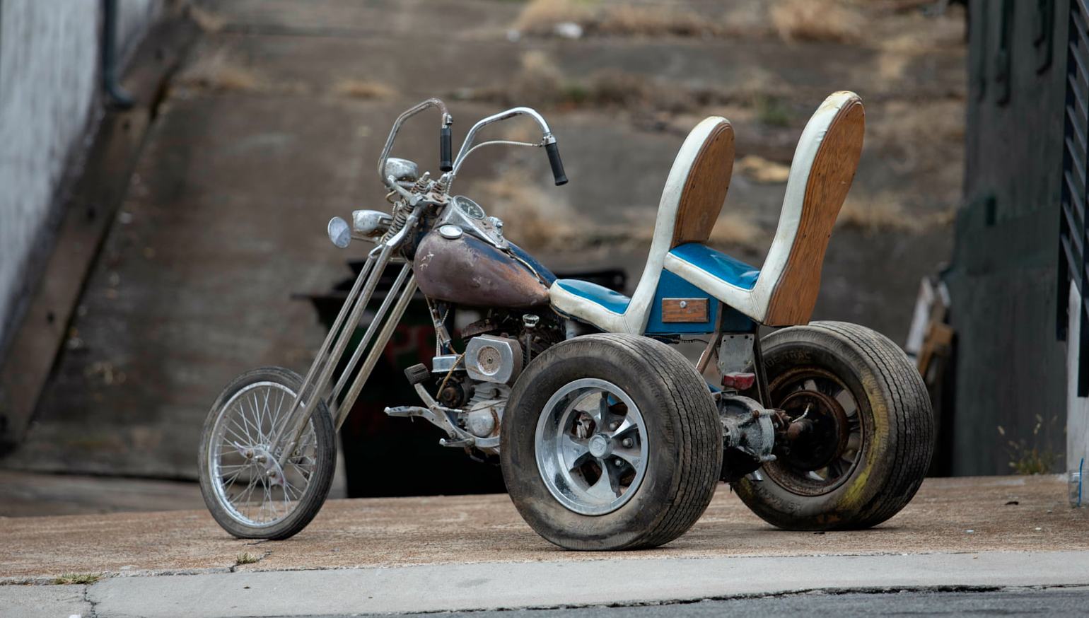 This steez machine was “found in a shed inside a junkyard in northern Iowa” before heading to Mecum. It started life as an unglamorous utility trike. An unknown builder modified it with classic custom touches like stacked headlights, high-back seats, a springer fork, chrome rear wheels, and funky paint. Stash your snacks and other road trip supplies in the locking compartment under the seat. This trike is a good example of the trend towards barn finds and period customs at Mecum, instead of the emphasis on factory correctness seen in the past.