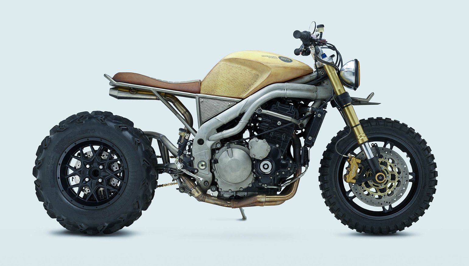 It plays out this way. Somebody does something that looks fresh. In this case, once everyone got tired of making café racers out of 1970s Hondas, someone made a “scrambler.” We started seeing more and more street bikes wearing tires with blocky tread, and it quickly pushed into the mass production world, with bikes like the Yamaha SCR950. Mass production has to play it safe. Customizers have to push the envelope. So that leads to the thinking that if blocky tread is good, fatter and blockier tires are better and, finally, a big, honking ATV tire that makes a sweet-handling bike a slower, butt-pounding pain to ride has got to be better yet.