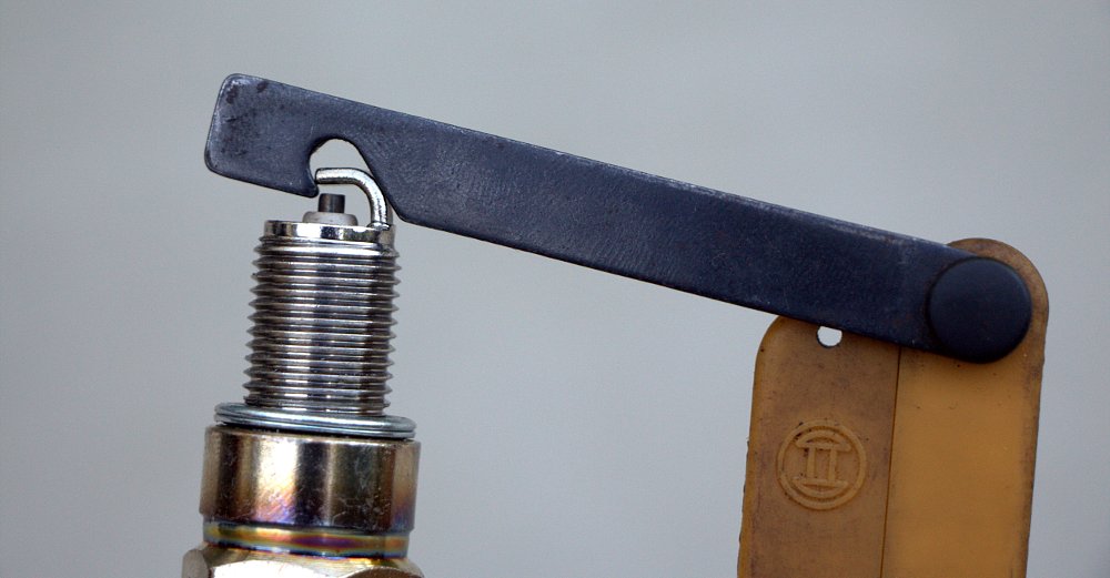 This gappin’ device features a ramp of increasing thickness that traverses the circumference of the tool. The idea here is to slip the tool between the spark plug’s electrodes and rotate the tool until light drag is felt between them, and the tool will indicate the measurement of the gap. Should the gap be too wide, it can be closed by tapping the electrode on a convenient surface to close it suitably, taking care not to crack the porcelain or alumina insulator. (That’s the white part.)