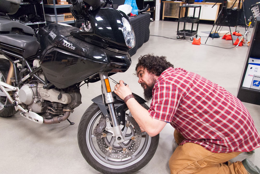 At this point, old Lemmy was getting tired and thirsty. Ryan started throwing his fairings back on. (It took me about 20 seconds to write that sentence. It took him about 40 minutes to actually do it!) We aimed his lights indoors to get them as close as possible. His bracket had a built-in five-degree outward splay. Since many mounting setups are more generic and do not automatically include that, I try to aim all auxiliary lights at the edges of the road. It helps North American riders in rural areas spot wildlife encroaching on the tarmac. (On a slightly unrelated note, headlights should always be aimed down and to the right slightly in this country to avoid blinding oncoming traffic.)