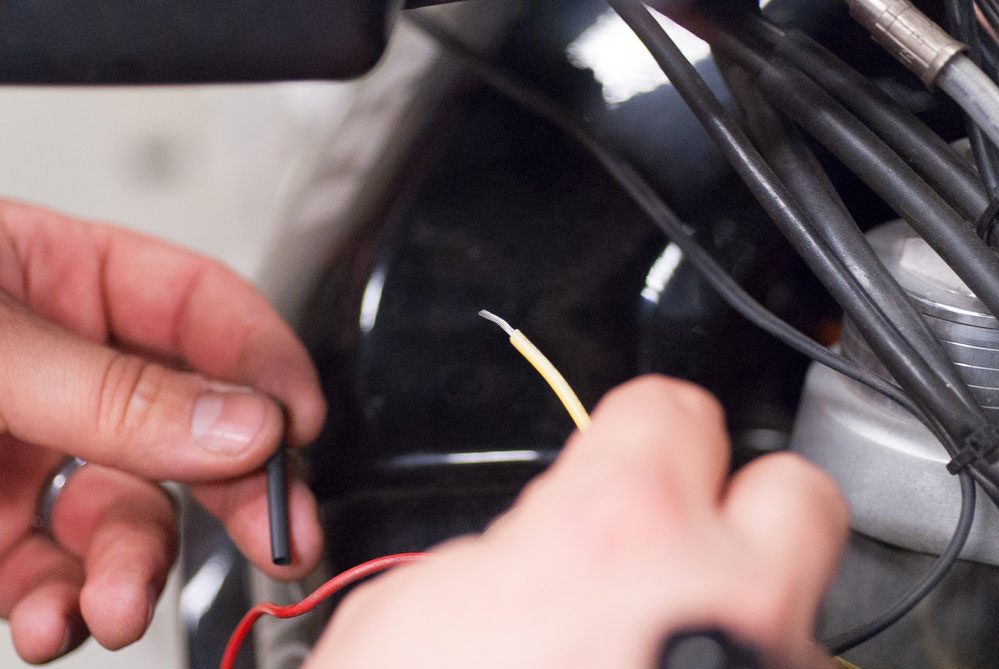 One of Lemmy's wiring tricks is to insert the heat shrink up inside the connector shroud prior to crimping. This gives a nice weather-tight seal when the crimp is applied and the heat shrink assumes its final size. Photo by Ryan Targoff.Keep it waterproof. I have a sequence I follow when crimping. For wiring that is gonna see some weather, like that on a bike, I use heat-shrinkable butt connectors and terminals. I slide my heat shrink up into the connector, then apply heat to both the shrink and the terminal protector, which leaves me with a very water-tight electrical joint as those items fuse to the bare wire and insulation.