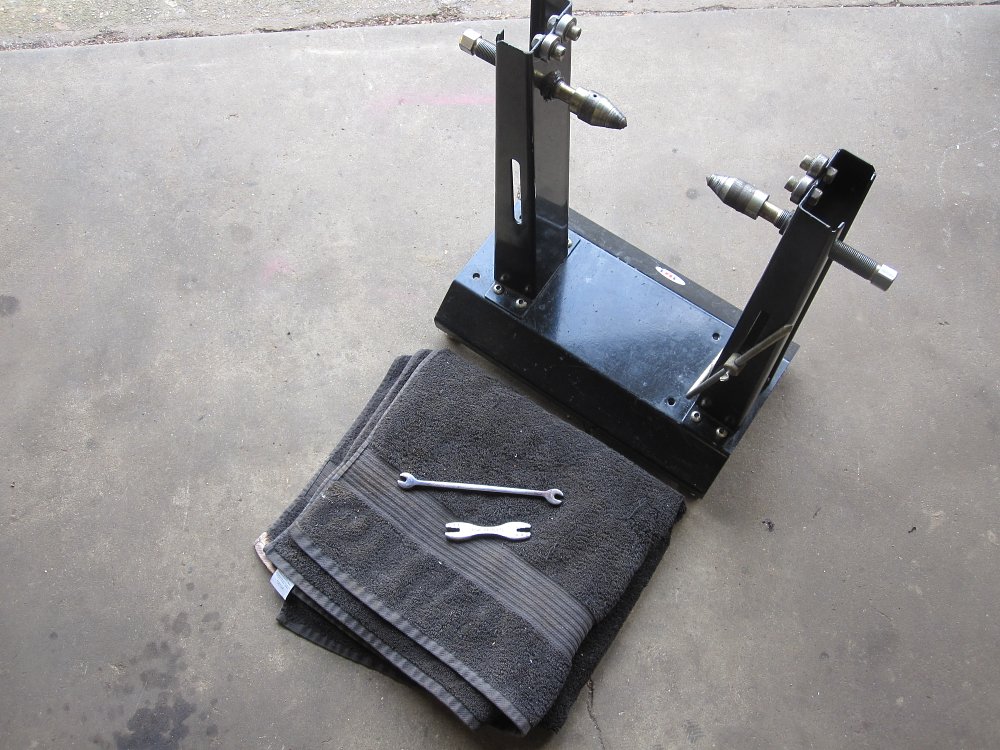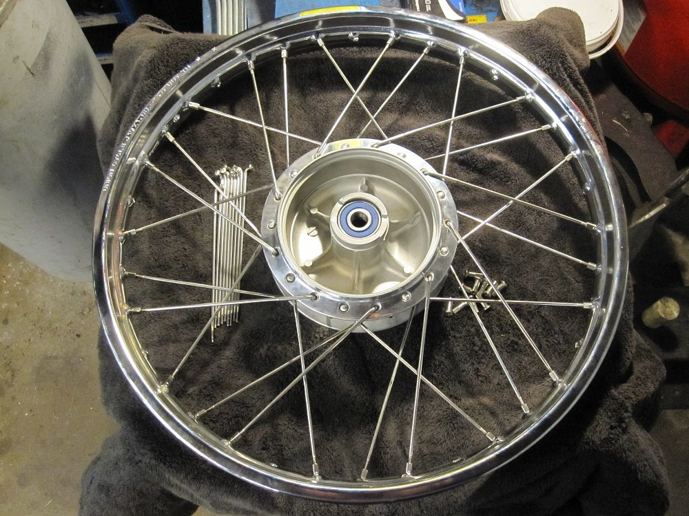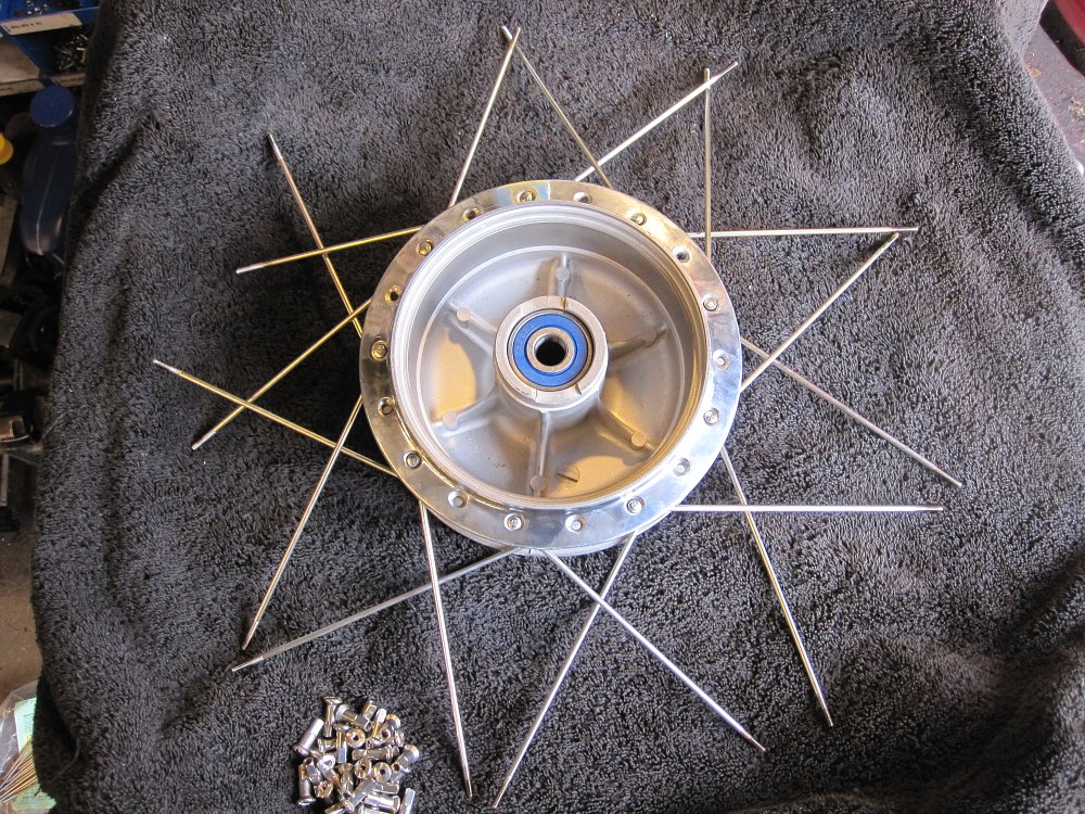 You will need a wheel truing stand, a properly sized spoke wrench, some anti seize, a measuring device and a workbench with an old blanket or towel to work on. A pair of bolt-cutters or an angle grinder with a cutoff wheel helps disassemble the wheel quickly if you are replacing the spokes.