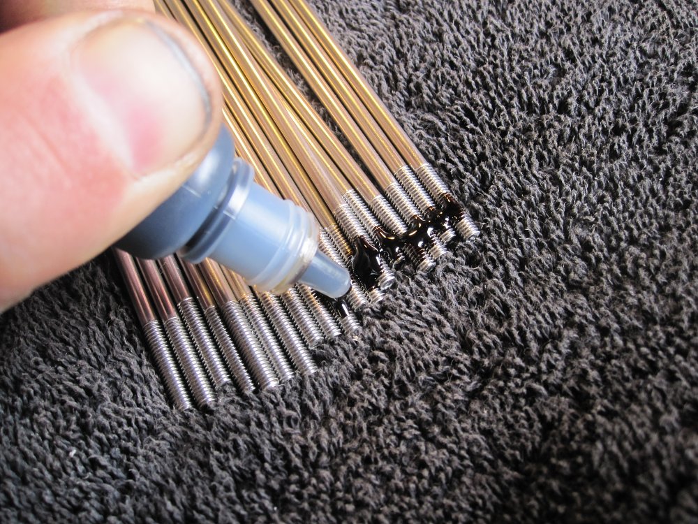 Separate your “outside” and “inside” spokes into two piles. If your hub has a big side and a small side, be sure to separate the spokes into four piles — long insides and outsides, and short insides and outsides. Put some anti-seize on the threads of each spoke and in the dimples of the hub. This ensures that you will get an even torque feeling in your spoke wrench when you tighten the wheel. It will also allow you to easily true or re-tension the wheel in the future if needed.